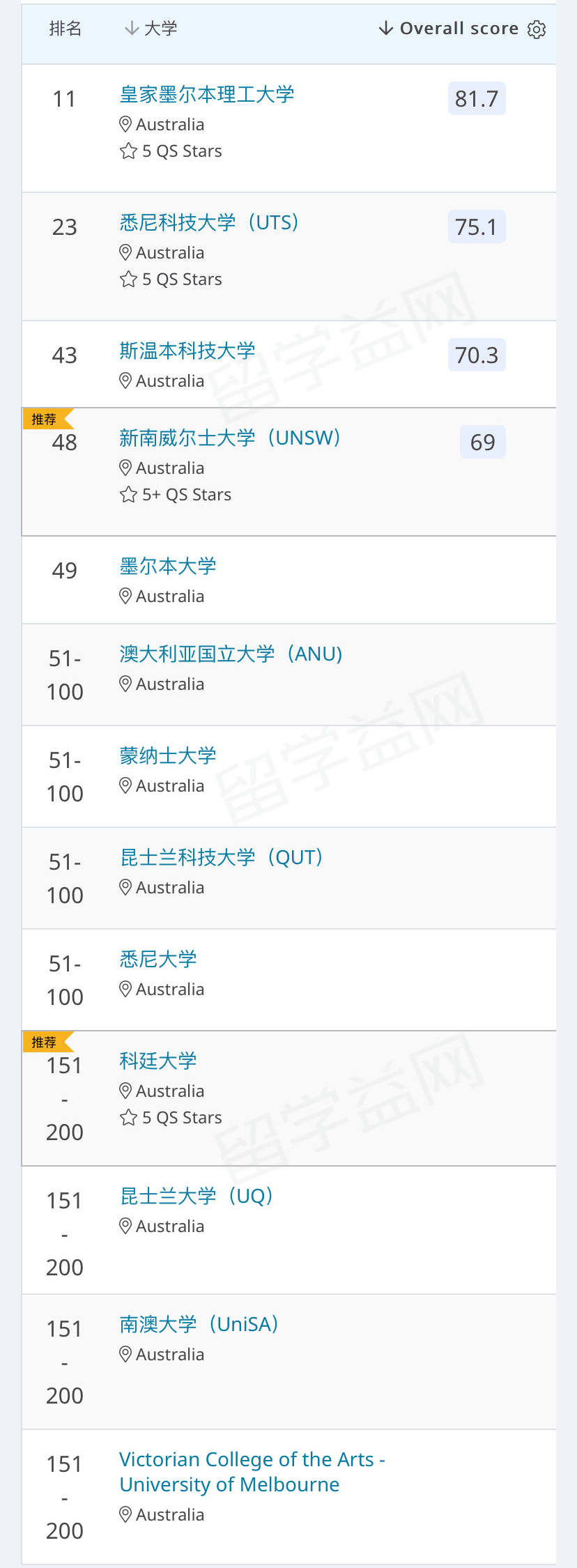 2020QS艺术与设计专业排名,澳洲非八大霸榜前3!