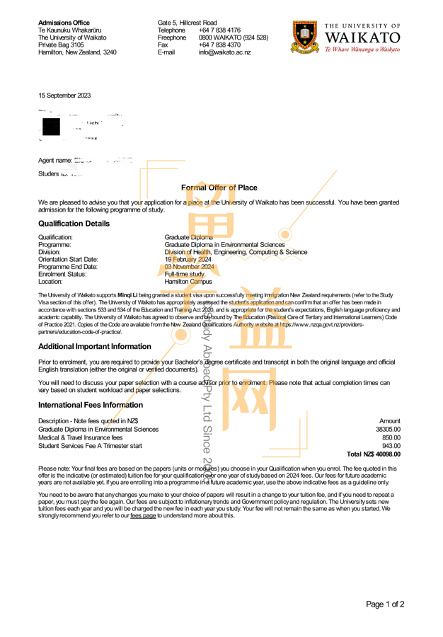 所以当即就决定了申请,而且沟通阶段期间,她的PTE成绩也考到了59,所以很快就把申请材料给了我们留学益网,也是在递交后没有多久,怀卡托大学就给学生发放了正式录取offer!学生对于可以拿到录取是非常满意的,现在确认就读该校,着手开始办理赴新西兰的学生签证了。