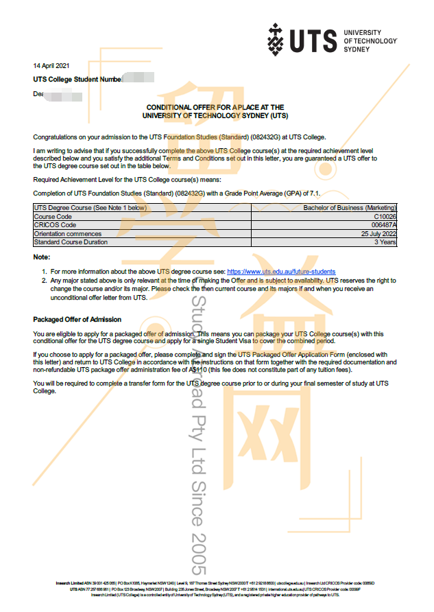 恭喜袁同学通过留学益网获得悉尼科技大学预科+3年商科本科offer。袁同学将就读悉尼科技大学8个月的预科课程,随后进入商科本科市场营销方向。