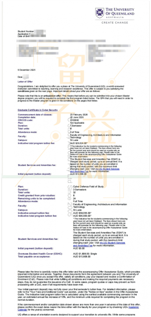 西南大学C同学成功获得昆士兰大学硕士预科与网络安全硕士的打包录取,这一路径为在升学道路上遇到类似挑战的同学提供了极具参考价值的方案。尤其是对于希望跨专业申请,或因缺乏兴趣导致本科成绩不具竞争力的学生,昆士兰的硕士预科是一个关键且结果可控的升学跳板~商科、IT 、工程、传媒、经济、社科类硕士课程均有机会,课程范围可选很广泛。