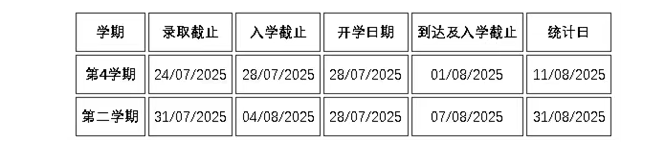 • 11月标准预科课程的澳洲境外申请人、以及8月/11月预科课程的境内申请人(含持澳洲学生签证但暂时离境者),申请截止日期均为7月27日,接offer截止日期均为8月1日。