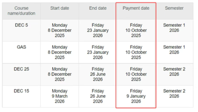 此外,CET还公布了最新的2026年费用,DEC学费上涨至684澳元/周,GAS学费上涨至584澳元/周,管理费及材料费保持不变。CET还提醒:在10月10日前获得2026年入学DEC或GAS课程offer并完成接受及缴费的学生,将继续保持2025年费用。
